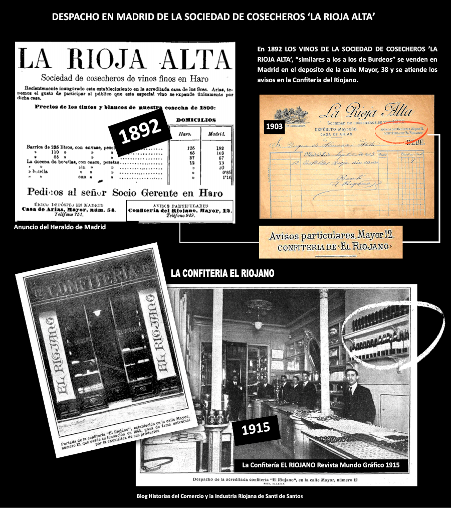 En 1892 la Sociedad de cosecheros de vinos finos de Haro distribuía su vino 'La Rioja Alta' en Madrid a través de su socio de la Casa Arias y se vendía a los particulares en la hoy, histórica y afamada confitería 'El Riojano'.